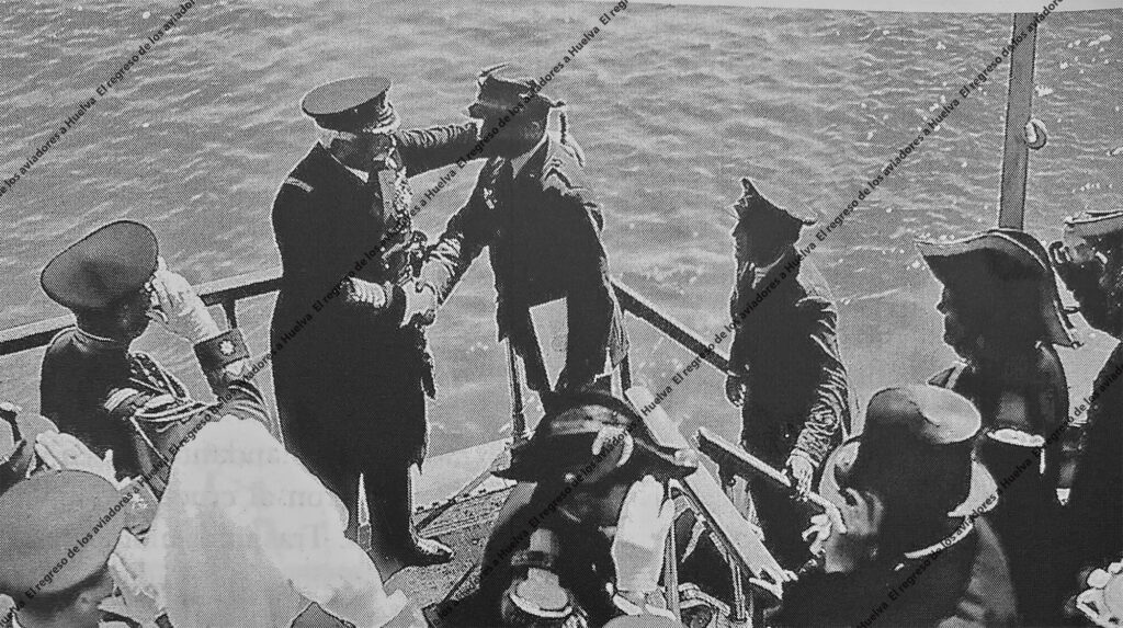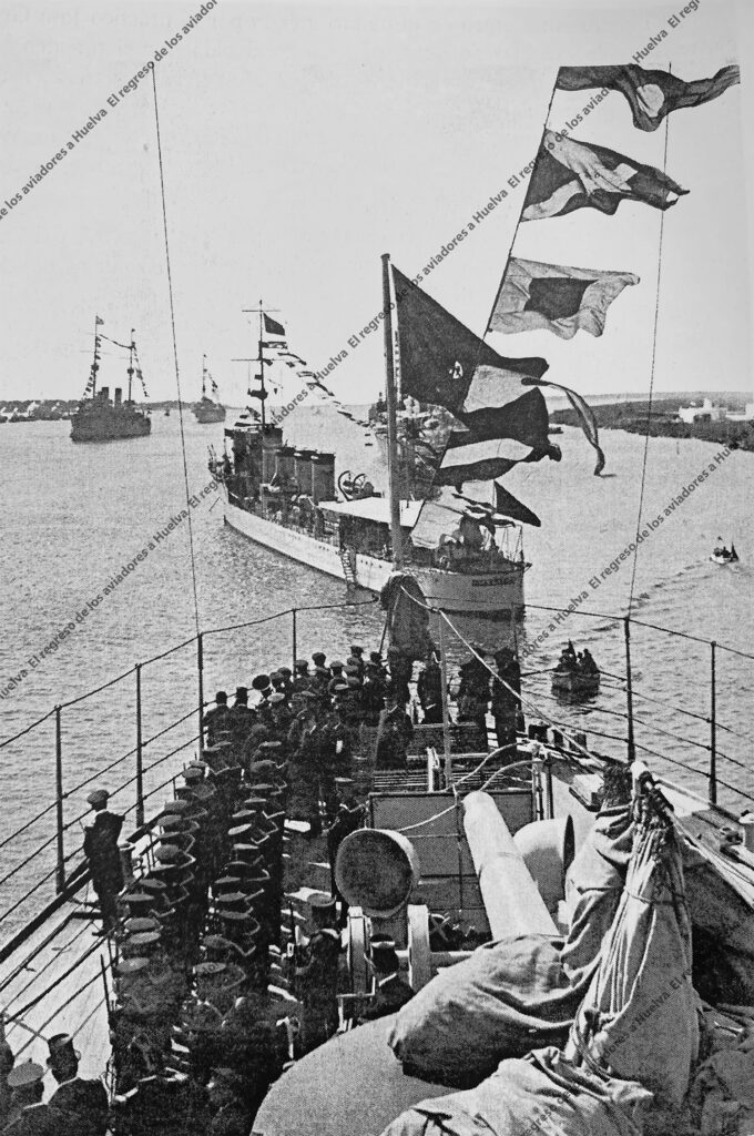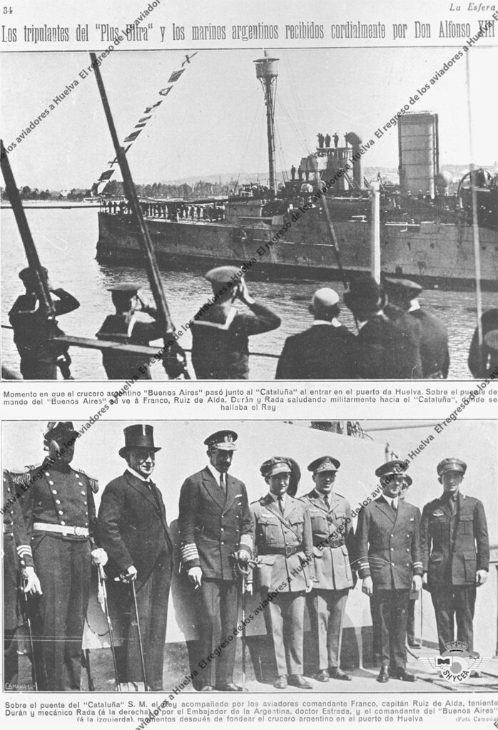 El “Buenos Aires” entraba por la barra a las ocho treinta horas. Alrededor de la nueve el tren real entraba en la estación e inmediatamente Su Majestad se desplazó en automóvil al puerto, acompañado por el ministro de Marina, Honorio Cornejo, y otras personalidades. Desde allí se subieron a una lancha para embarcar en el crucero “Cataluña”. Sobre las diez de la mañana, ambos buques con toda la marinería e invitados, escenificaron un saludo militar desde cubierta y a continuación los aviadores y las autoridades argentinas se trasladaron al buque insignia español.